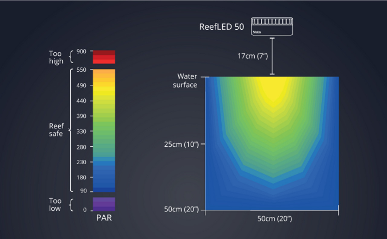 Uniquely designed with a light intensity and spectrum that is 100% utilized by corals, the ReefLED 50 is ideal for promoting coral growth and coloration. It is also equipped with a built-in Wi-Fi that allows total control via the ReefBeat app. The app includes pre-set lighting programs, along with additional features such as sunrise/sunset effects, lunar cycle moon light, random clouds, and even an acclimation program for new installations.